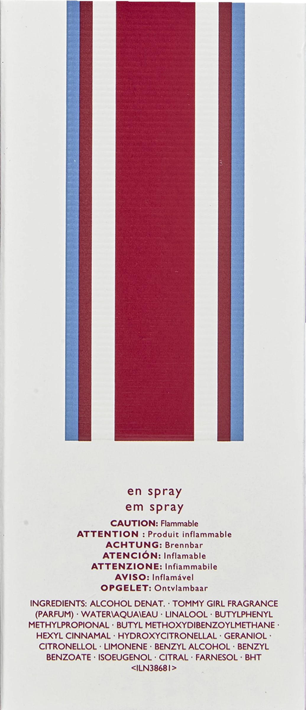 Alcohol Denat., Fragrance (Parfum), WaterAquaEau, Linalool, Hydroxycitronellal, Geraniol, Citronellol, Limonene, Benzyl Alcohol, Hexyl Cinnamal, Isoeugenol, Benzyl Benzoate, Citral, Butyl Methoxydibenzoylmethane, Bht